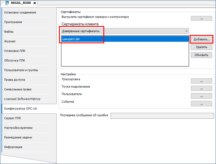 • Добавьте сертификат клиента UaExpert в "Доверенные сертификаты" сервера.