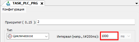 • Назначьте интервал вызова задачи "TASK_PLC_PRG" 1000 мс.