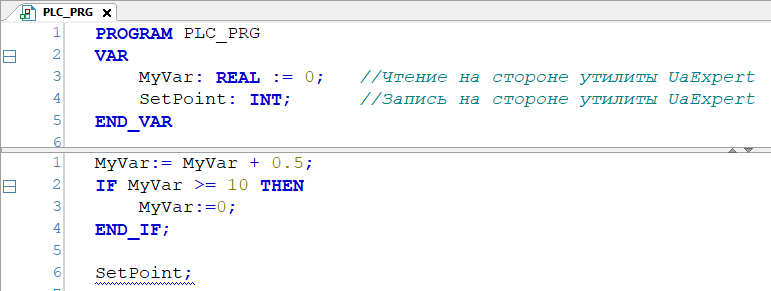 • В разделе кода программы "PLC_PRG" напишите следующий код.