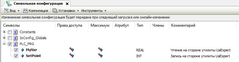 • Выполните компиляцию и в окне "Символьная конфигурация" установите флаг у переменных, участвующих в OPC UA коммуникации.