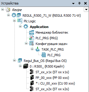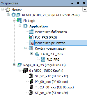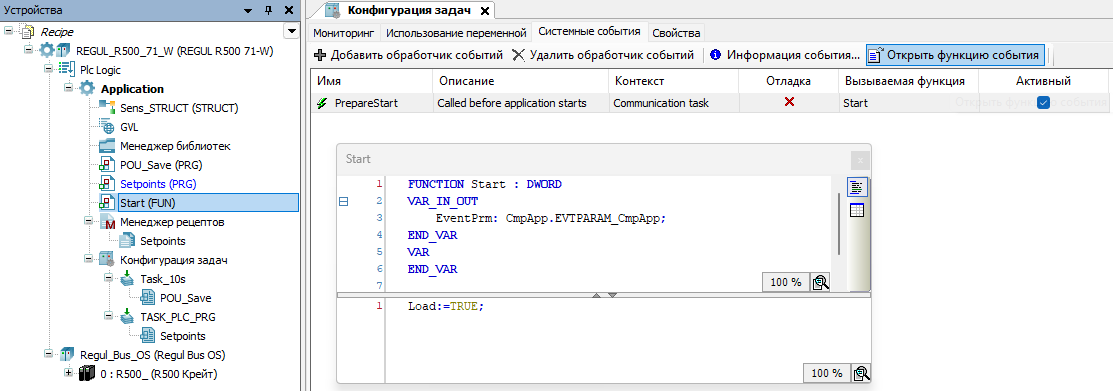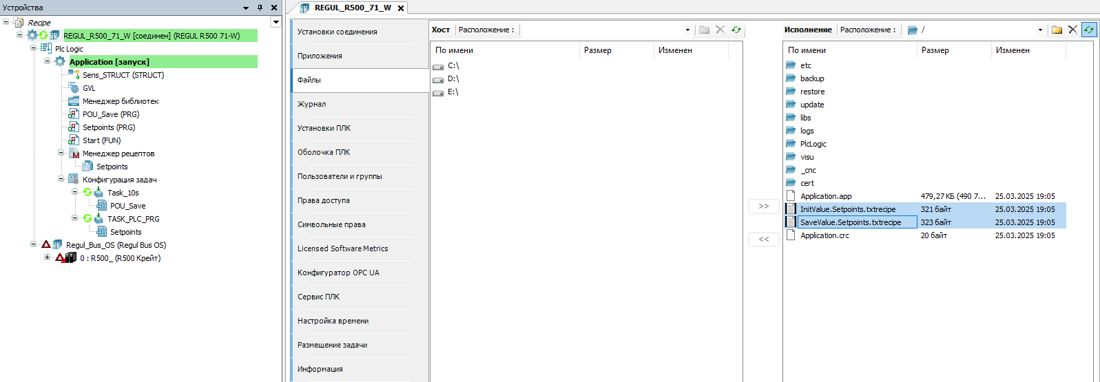 В раздел кода программы Setpoints вставьте следующий код:IF InitF THEN //Устанавливается кнопкой на визуализацииRecipeManCommands.LoadAndWriteRecipe('Setpoints', 'InitValue'); //Загрузка рецепта из стандартного файла рецептов и затем запись рецепта в переменные ПЛКInitF:=FALSE;RecipeManCommands.ReloadRecipes('Setpoints'); //Перезагрузка списка рецептов из файловой системыEND_IFIF Load THEN //Устанавливается в функции Start перед запуском приложенияRecipeManCommands.LoadAndWriteRecipe('Setpoints', 'SaveValue'); //Загрузка рецепта из стандартного файла рецептов и затем запись рецепта в переменные ПЛКRecipeManCommands.ReloadRecipes('Setpoints'); //Перезагрузка списка рецептов из файловой системыLoad:=FALSE;END_IFIF Save THEN //Устанавливается в функции POU_Save каждые в 10 секунд.RecipeManCommands.ReadAndSaveRecipe('Setpoints', 'SaveValue'); //Считывание текущих значений из ПЛК в рецепт и затем сохранение рецепта в стандартном файле рецептовSave:=FALSE;END_IF