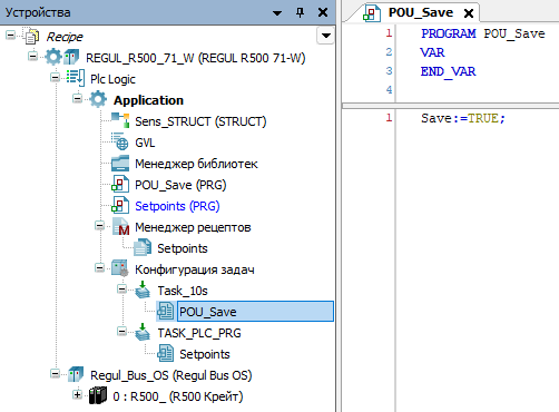 Создайте программу "POU_Save" и напишите в ней код, представленный ниже. Поместите программу "POU_Save" в задачу "Task_10s".