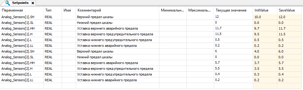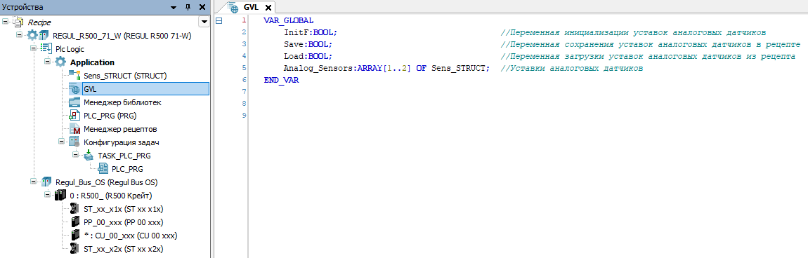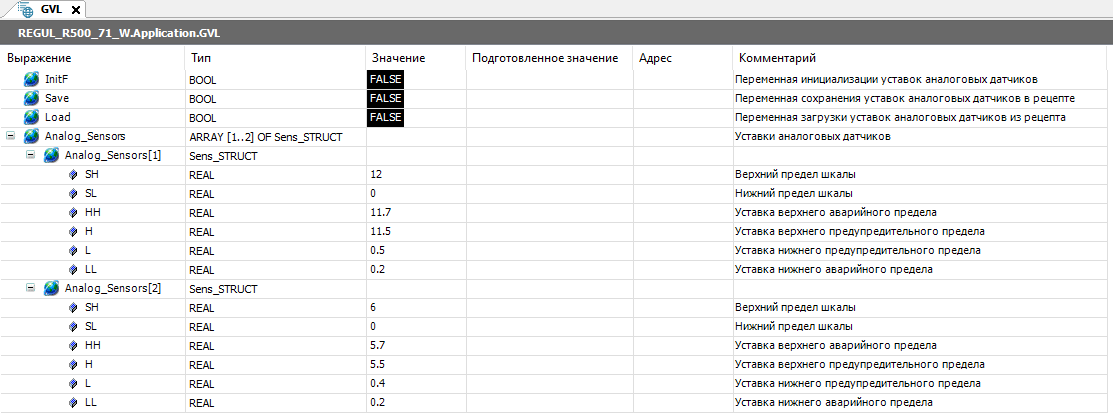 Создайте список глобальных переменных GVL. Вставьте в него следующие переменные:InitF:BOOL; //Переменная инициализации уставок аналоговых датчиковSave:BOOL; //Переменная сохранения уставок аналоговых датчиков в рецептеLoad:BOOL; //Переменная загрузки уставок аналоговых датчиков из рецептаAnalog_Sensors:ARRAY[1..2] OF Sens_STRUCT; //Уставки аналоговых датчиков
