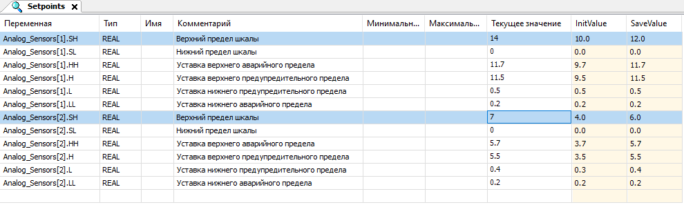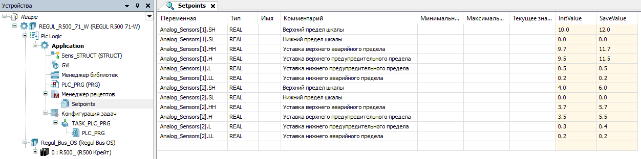 Добавьте группу рецептов Setpoints в состав менеджера рецептов. Заполните группу рецептов переменными массива Analog_Sensors из списка глобальных переменных GVL. Добавьте два рецепта InitValue и SaveValue и заполните их значениями, представленными на картинке ниже.