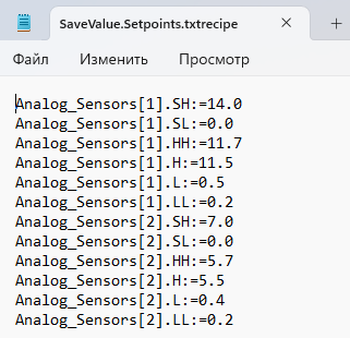 Выгрузите файл рецепта "SaveValue.Setpoints" из контроллера на компьютер и откройте. Убедитесь, что значения компонентов соответствуют текущим значениям переменных массива Analog_Sensors.