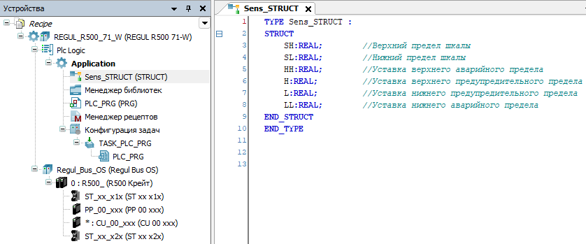 В состав приложения "Application" проекта добавьте структуру с именем "Sens_STRUCT". Вставьте в структуру следующие компоненты:SH:REAL; //Верхний предел шкалыSL:REAL; //Нижний предел шкалыHH:REAL; //Уставка верхнего аварийного пределаH:REAL; //Уставка верхнего предупредительного пределаL:REAL; //Уставка нижнего предупредительного пределаLL:REAL; //Уставка нижнего аварийного предела