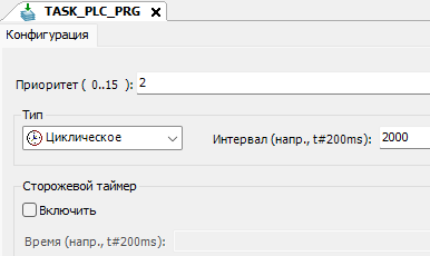 Задайте интервал вызова задачи TASK_PLC_PRG 2000 мс.