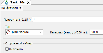 В состав компонента "Конфигурация задач" добавьте новую задачу с именем "Task_10s", задайте ей интервал вызова 10000 мс и приоритет 3.