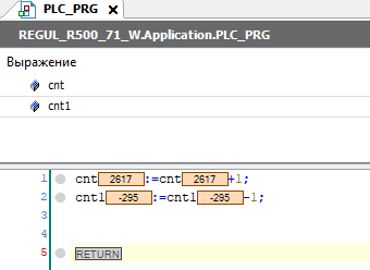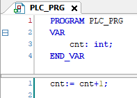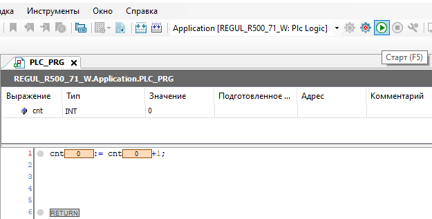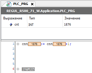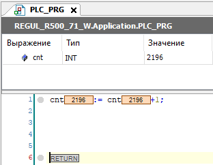 Перейдите в программу "PLC_PRG" и убедитесь, что значение переменной "cnt" увеличивается.