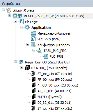 Соберите аппаратную конфигурацию для ПЛК:- Модуль оконечный R500 ST 02 012.- Модуль источника питания R500 PP 00 011.- Центральный процессор R500 CU 00 071 W.- Модуль аналогового ввода R500 AI 08 041.- EMPTY- Модуль дискретного ввода R500 DI 32 011.- Модуль оконечный R500 ST 02 022.