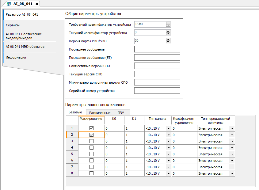 Перейдите в крейт и выберете модуль "AI_08_041". Откройте вкладку "Редактор AI_08_041" и замаскируйте 1 и 2 каналы модуля.