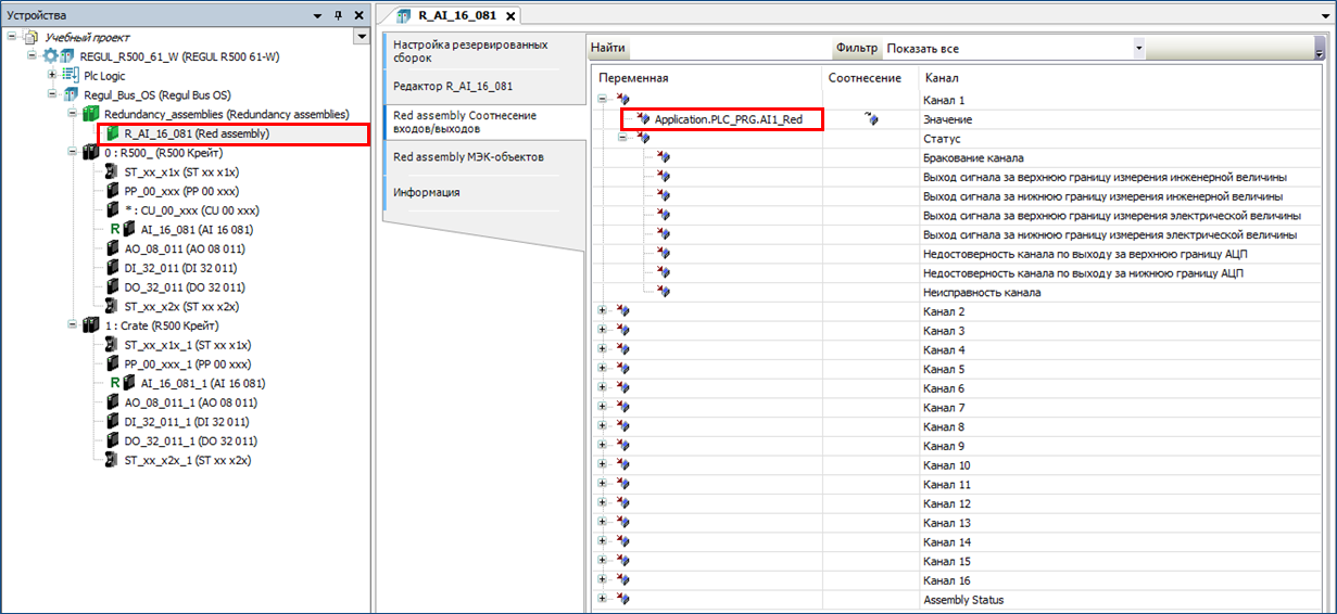 В поле «Соотнесение входов/выходов» каналам виртуального модуля назначаются переменные стандартным образом. Переменные могут быть использованы в программном коде.