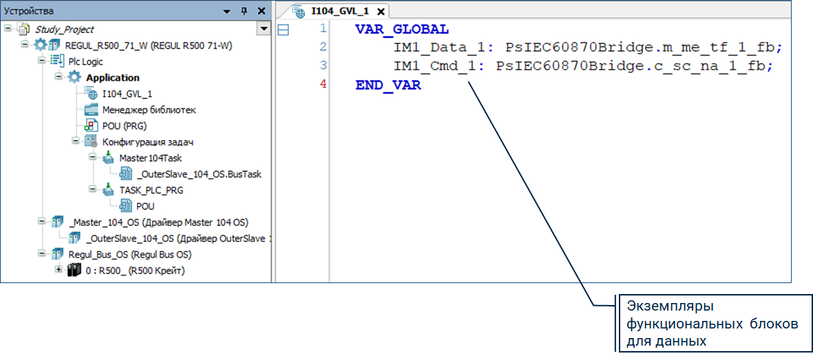 Таблица глобальных переменных «I104_GVL_1» и экземпляры функциональных блоков в ней генерируются автоматически, если установлен флаг «Создавать экземпляры IEC переменных и привязку при добавлении параметров» во вкладках «Данные» и «Команды» компонента «_OuterSlave104_OS».