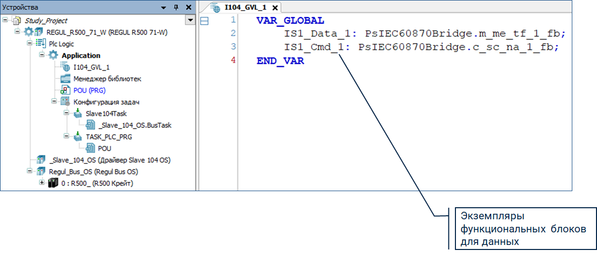 Таблица глобальных переменных «I104_GVL_1» и экземпляры функциональных блоков в ней генерируются автоматически, если установлен флаг «Создавать экземпляры IEC переменных и привязку при добавлении параметров» во вкладках «Данные» и «Команды» компонента «_Slave104_OS».