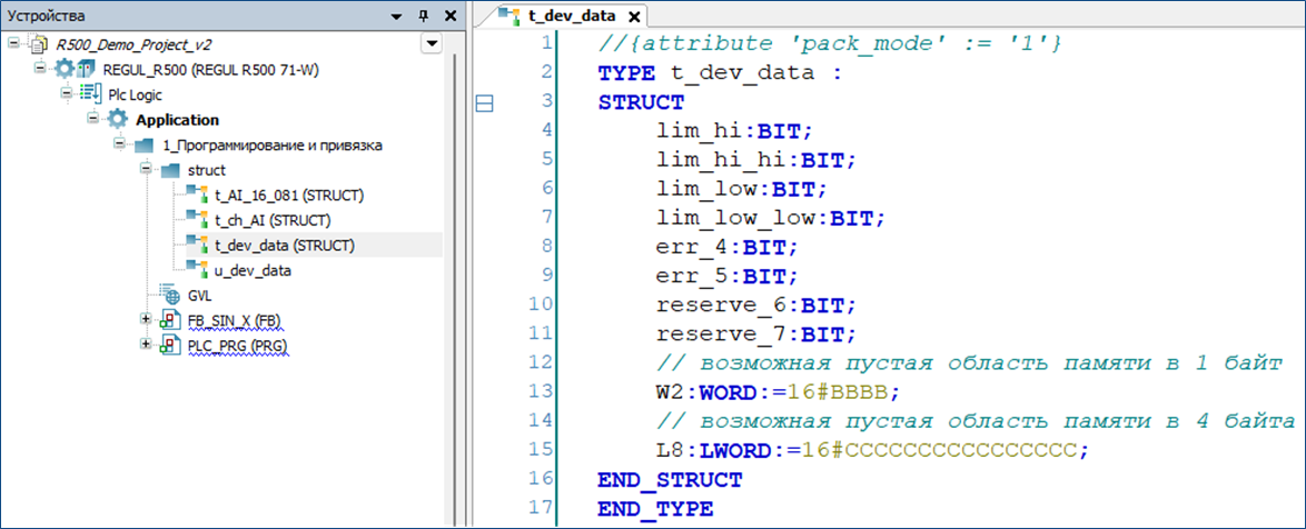 Размерность структурного типа t_dev_data без атрибута pack_mode составляет 16 байт. С атрибутом pack_mode – 11 байт.