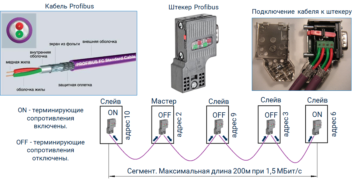 На штекере есть переключатель, который включает терминирующие сопротивления, установленные внутри штекера. Данные сопротивления необходимы для согласования волнового сопротивления кабеля и входного сопротивления активного устройства с целью устранения искажения сигнала и увеличения скорости сети. Поэтому на концах сегмента переключатель должен быть в положении ON, а на промежуточных устройствах - в положении OFF.