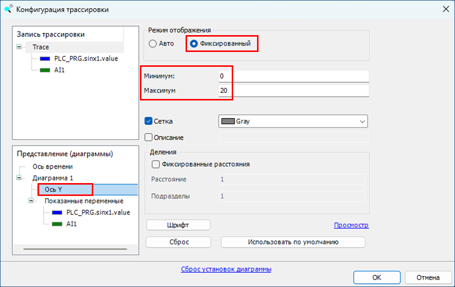 При текущих настройках вертикальная ось Y будет иметь фиксированную шкалу в диапазоне от 0 до 20 единиц.