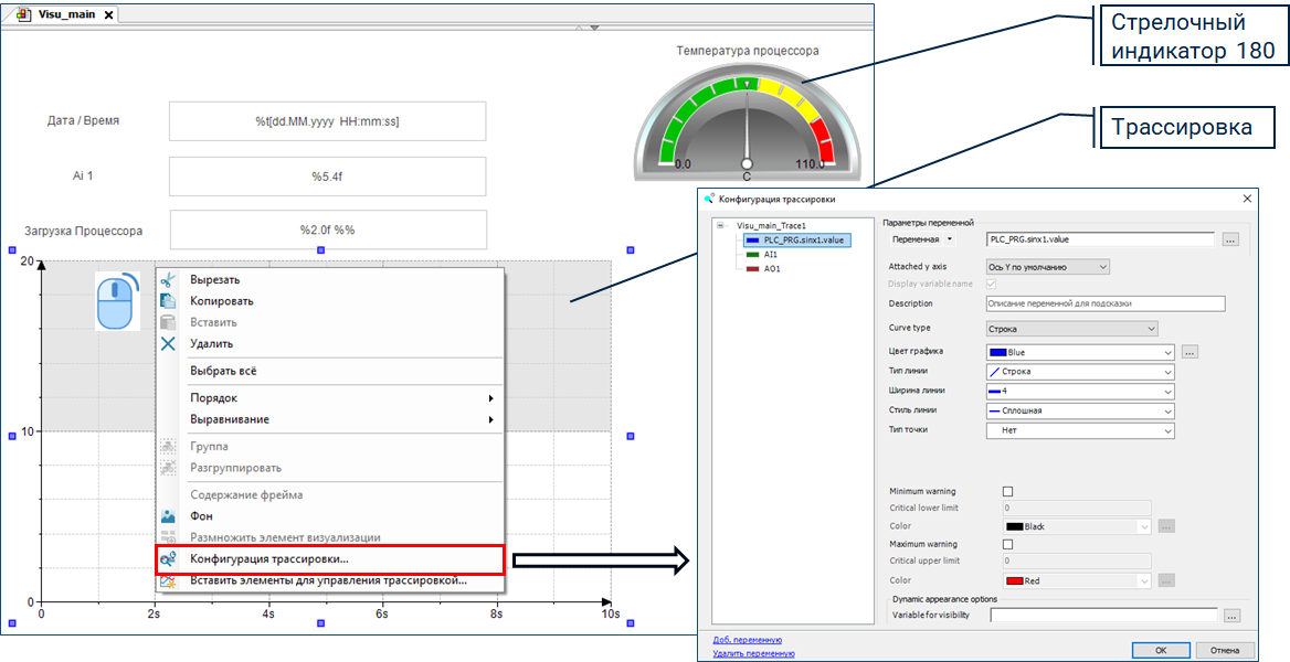 Из группы «Специальные элементы управления» окна «Панель инструментов визуализации», перенесите на поле экрана «Visu_main» объект «Трассировка».