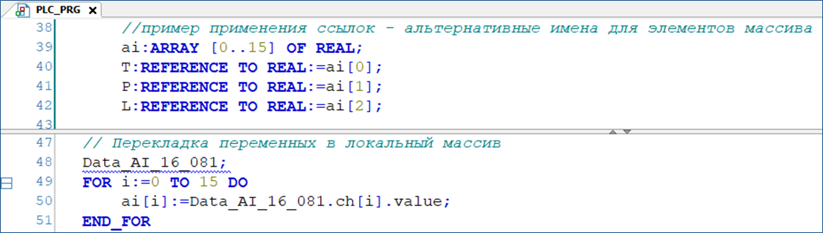 При входе в цикл FOR переменная i первоначально принимает значение 0, и выполняется тело цикла, где в нулевой элемент массива ai[0] записывается значение первого канала модуля AI контроллера из переменной Data_AI_16_081.ch[0].value. В следующем цикле переменная i принимает значение 1, и в теле цикла работа будет с элементами массивов ai[1] и Data_AI_16_081.ch[1].value. В итоге будет выполнено 16 циклов FOR и в каждом новом цикле переменная i будет увеличиваться на 1, пока не примет значение 15. Когда i = 15, тело цикла выполняется последний раз и происходит выход из него. Переменная i также является индексом массивов ai и Data_AI_16_081.ch, значение которой динамически изменяется.