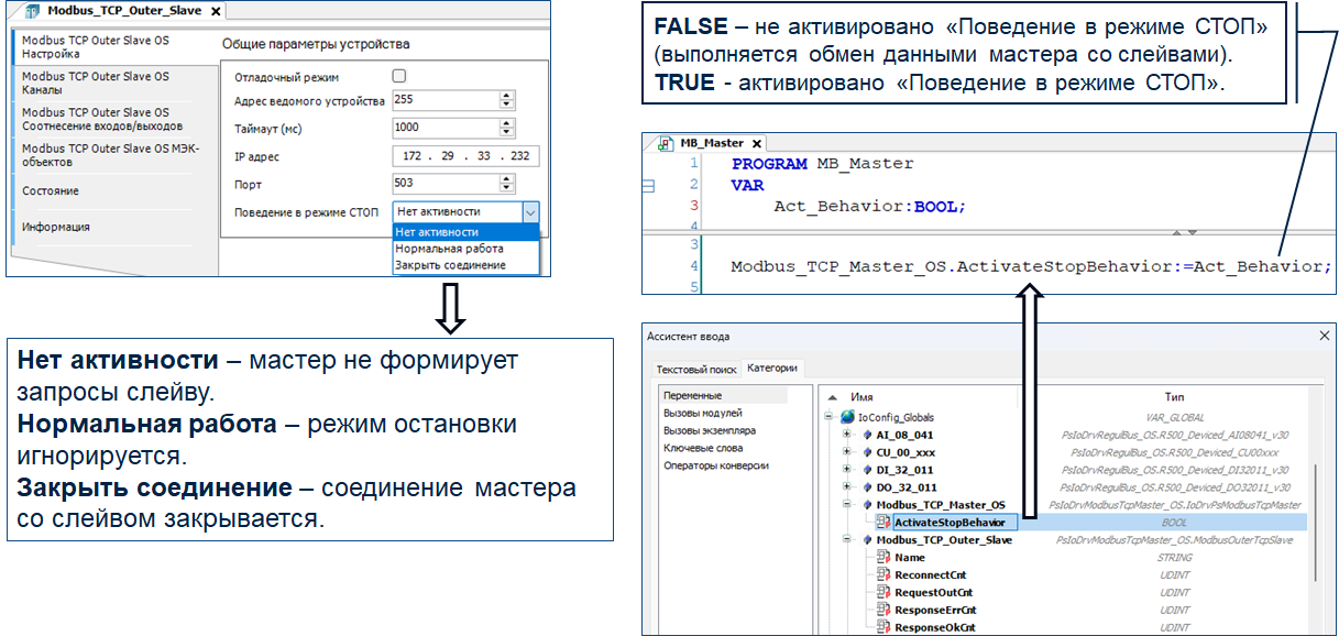 Например, «ActivateStopBehavior» позволяет активировать действие, указанное в поле «Поведение в режиме СТОП». Это может потребоваться в резервированной системе, если требуется, чтобы ведомый контроллер не вел опрос слейвов.