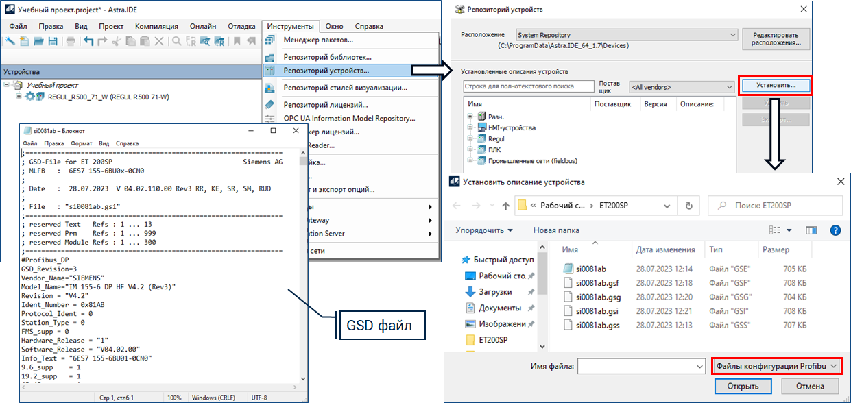 GSD (General Station Description) файл – это описательный файл устройства, который создается по определенному стандарту производителем устройства. Если необходимо настроить обмен данными по сети Profibus DP между контроллером REGUL R500 и определенным слейв-устройством, то GSD-файл слейв-устройства нужно будет установить в среде разработки Astra.IDE и использовать его для интеграции слейв-устройства в проект.