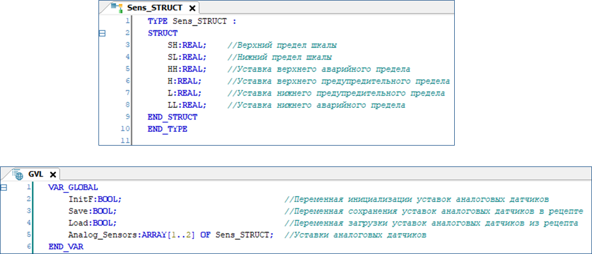 В массиве структур «Analog_Sensors» списка глобальных переменных GVL сохраняются рабочие значения уставок датчиков, используемые в прикладной программе.