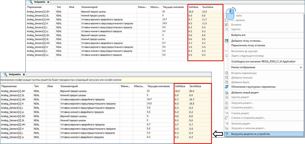 19.10. ВЫГРУЗКА РЕЦЕПТА ИЗ УСТРОЙСТВА Автоматическое обновление отображения измененных значений данных рецептов в группе рецептов среды Astra.IDE не выполняется. Для обновления данных выберите из контекстного меню действие «Выгрузить рецепты из устройства».