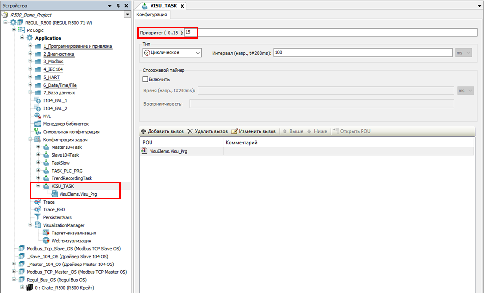 Автоматически назначаемый приоритет у задачи VISU_TASK с номером 15 – это самый низкий приоритет. Его можно повысить, например до 9, с целью уменьшения «подвисаний» и более стабильной работы визуализации. Но приоритет задачи VISU_TASK не должен быть выше, чем у основных задач (например тех задач, из которых вызываются программы управления технологическими объектами).