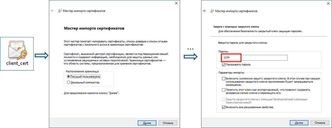 Загрузка SSL-сертификата на ПК выполняется запуском client_cert и последовательным переходом между окнами мастера импорта сертификатов. Для обеспечения безопасности на одном из этапов потребуется ввести пароль 1234. Остальные настройки можно оставить по умолчанию.
