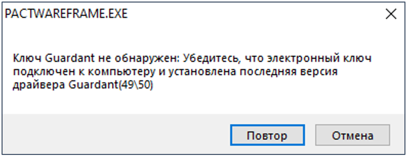 Если при попытке добавления устройства Regul HART Communication не будет подключен USB ключ Guardant Stealth II, то появится информационное окно с сообщением об ошибке: