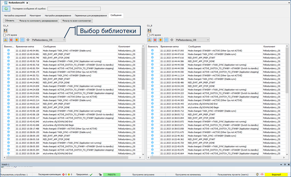 Во вкладке «Сообщения» окна «RedundancyOS» доступны для просмотра сообщения из журналов модулей CU.