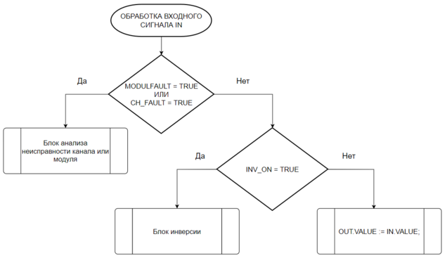 В штатном режиме работы значение входного сигнала сначала проходит через блок инверсии, где при включенной функции инвертирования значение меняется на противоположное входному значению и выдается на значение выхода OUT.
