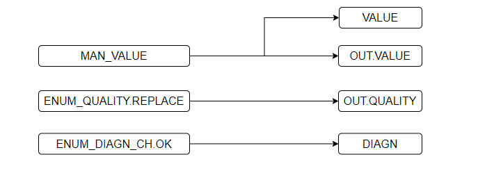 Для перевода алгоритма в режим подмены необходимо на входе MAN_ON установить значение TRUE. При этом на выход алгоритма транслируется значение MAN_VALUE, а качество выходного сигнала устанавливается в значение REPLACE.