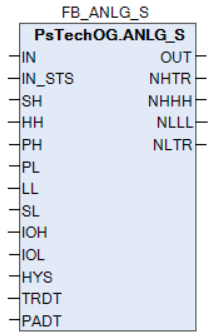 Функциональный блок ANLG_S преобразует шкалу аналогового входа IN, применяя SH, SL, IOH и IOL, а затем выводит преобразованный аналоговый выход OUT. Он сравнивает это выходное значение OUT с четырьмя типами пороговых значений HH, PH, PL и LL и выводит состояние сигнализации NHTR, NHHH, NLLL или NLTR. Каждое состояние сигнализации устанавливается как появившееся (FALSE), если только состояние сигнализации длится в течение заданного периода времени (TRDT или PADT) или дольше.
