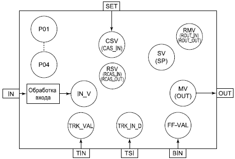 Блок FF_PID связывается с блоком PID (ПИД, ПИ, И - регулятор) полевого устройства Fieldbus для обеспечения управления и контроля со стороны РСУ и АРМ оператора.