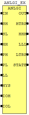 Функциональный блок ANLGI преобразует шкалу входного значения IN, применяя SH, SL, IOH и IOL, и затем вычисляет выходное значение OUT. Он сравнивает это выходное значение с четырьмя типами пороговые значения (HH, PH, PL и LL) и выводит статус тревоги (HTRP, HHH, LLL или LTRP).