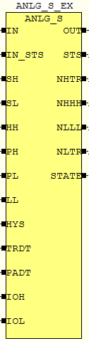 Функциональный блок ANLG_S преобразует шкалу аналогового входа IN, применяя SH, SL, IOH и IOL, а затем выводит преобразованный аналоговый выход OUT и состояние данных STS аналогового входа IN. Он сравнивает это выходное значение OUT с четырьмя типами пороговых значений HH, PH, PL и LL и выводит состояние сигнализации NHTR, NHHH, NLLL или NLTR. Каждое состояние сигнализации устанавливается как появившееся (FALSE), если только состояние сигнализации длится в течение заданного периода времени (TRDT или PADT) или дольше.