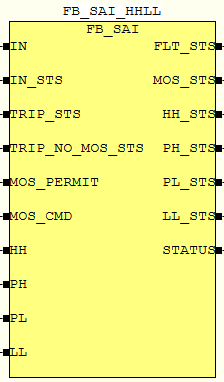 Этот блок используется для обработки аналоговых входных сигналов с детектированием по H/HH и по L/LL. Входное значение IN подключается к измеренному значению канала аналогового ввода или к выходу блока шкалирования.