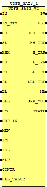 При обнаружении неисправности IOP активируется сигнализация IOP, а выход FLT блока устанавливается на FALSE. При этом если отключена функция удержания значения при отказе (вход HLD = 0), то выходы защит LLL_TRP, LL_TRP, L_TRP, H_TRP, HH_TRP и HHH_TRP будут переведены в отключенное состояние FALSE. Чтобы выходы защит фиксировались при возникновении неисправности, установите на вход HLD значение 1 или 2. При HLD = 1 произойдет заморозка значения PV до отказа канала, и значения выходов защит будет соответствовать этому значению. При HLD = 2 произойдет подстановка значения PV на заранее заданное значение из переменной HLD_VALUE, значения выходов защит так же будут соответствовать данному значению.