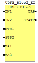 Этот функциональный блок выдает TRUE на TRP, если входы IN1 и IN2 исправны (TRUE) и IO, с которыми связаны эти входы, не находятся в состоянии BAD (STS1 и STS2 равны TRUE).