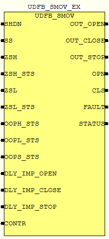 Данный блок предназначен для работы с электрофицированной задвижкой с одним соленоидом и двумя концевыми выключателями. С помощью входного параметра SS блок может быть сконфигурирован по типу FC (SS = FALSE, при срабатывании защиты клапан переводится в безопасное положение ЗАКРЫТО) или по типу FO (SS = TRUE, при срабатывании защиты задвижка переводится в безопасное положение ОТКРЫТО).