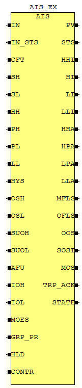 В случае отказа канала (вход IN_STS = FALSE) поведение параметра PV будет зависеть от входного конфигурационного параметра HLD (удержание при отказе):
