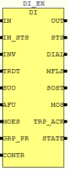 Функция инвертирования: Для задания функции инвертирования используется вход INV. Входной параметр INV устанавливается равным TRUE для обработки сигналов типа DI-E (нормально разомкнут), и равным FALSE для обработки сигналов типа DI-D (нормально замкнут).