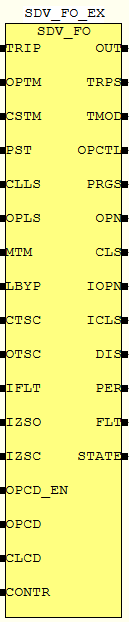 Функция SDV реализуется с использованием функционального блока SDV_FO для клапана с безопасным положением ОТКРЫТО. Эти функциональные блоки также могут использоваться для SDV с испытанием при неполном ходе.