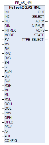 Селектор сигнала (AS_HML) сравнивает сигналы из 2-х позиционного или 3-х позиционного входа, а затем выбирает сигнал (PV) наибольшего, наименьшего, медианного или среднего значения в качестве выхода. Выбор может выполняться вручную.