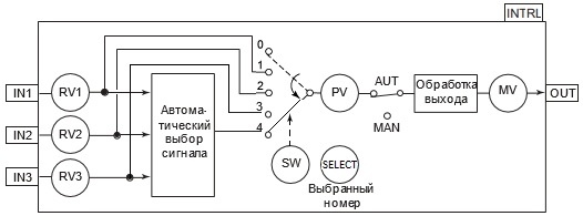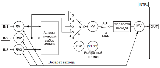 Сравниваются значения трех входных сигналов (RV1, RV2, RVЗ) и выбирается сигнал, который удовлетворяет условию выбора (зависит от сконфигурированного типа селектора).