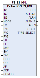 Селектор сигнала SS_HML сравнивает сигналы 2-х позиционного или 3-х позиционного входа, а затем выбирают сигнал (PV) наибольшего, наименьшего, медианного или среднего значения в качестве выходного. Выбор может выполняться вручную.
