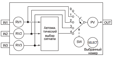 Сравниваются значения трех входных сигналов (RV1, RV2, RVЗ) и выбирается сигнал, который удовлетворяет условию выбора (зависит от сконфигурированного типа селектора).