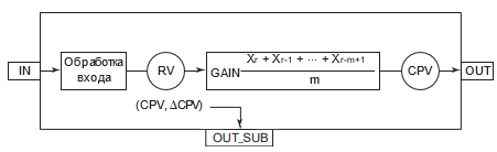 Блок скользящего среднего (AVE_M) является функциональным блоком, обеспечивающим получение скользящего среднего значения входных сигналов, полученных в промежутке между текущим моментом времени и определенным моментом времени в прошлом.