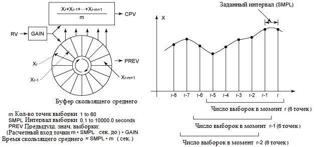 Инициализация скользящего среднего производится с помощью переключателя сброса (RST). Когда этот переключатель устанавливается в положение “TRUE”, происходит инициализация буфера скользящего среднего с использованием значения входа после первичной обработки (RV). По окончании инициализации переключатель сброса (RST) возвращается в положение “FALSE” (нормальное состояние). Когда состояние данных расчетного значения выхода (CPV) возвращается из BAD или из CALIBR (калибровка) в нормальное, происходит инициализация скользящего среднего.